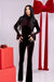Decupajul amplu la spate și croiala mulată conferă un efect wow, în timp ce pantalonul evazat alungește optic picioarele și oferă un aer glam modern. Materialul elastic se așază impecabil pe corp, iar mânecile lungi cu manșete evazate adaugă un plus de rafinament.